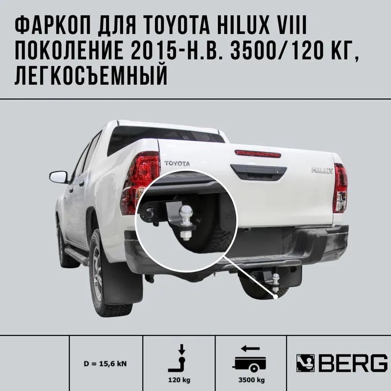 Фаркоп легкосъемный под квадрат Berg для Toyota Hilux (Тойота Хайлюкс) VIII поколение 2015-2020 2020-н.в., шар E, 3500/120 кг - это надежное и удобное решение для тех, кто ценит безопасность и комфорт при буксировке прицепа.