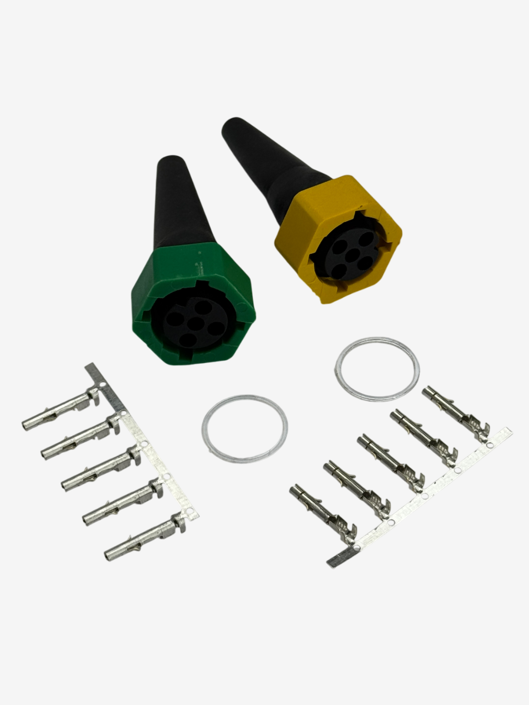 В набор входят левый (жёлтый) и правый (зелёный) 5-контактные байонеты — универсальное решение для стабильной работы световых приборов, поворотников и сигналов прицепа.