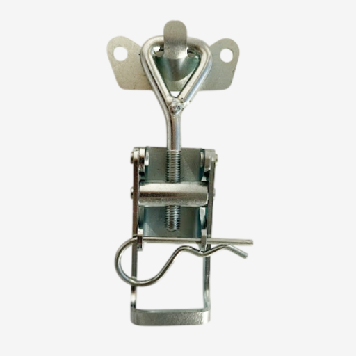 В конструкции замка предусмотрено основание с отверстием под шплинт, что позволяет фиксировать его в закрытом положении и предотвратить нежелательное открывание. Имеет петлю для сцепления с ответной частью - крючком.